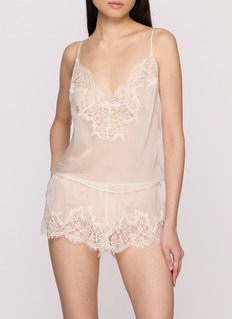 Raise the romance in this 100% silk chiffon set with a scoop neck cami and relaxed fit shorts. Features adjustable thin straps and an elastic waistband.